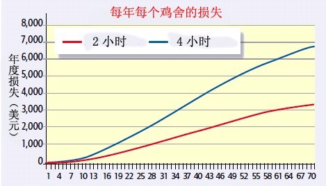 圖3顯示雞舍內(nèi)生長性能不佳的雞隨日齡相關(guān)的經(jīng)濟損失。按照這個信息計算存欄20,000只雞,每年5欄,付給養(yǎng)殖戶價格為$0.11/kg ($0.05/lb),38日齡達到目標(biāo)體重,在2小時和4小時時,分別損失$1,750和$3,500。對于日齡更大的雞群,經(jīng)濟損失會進一步增加。