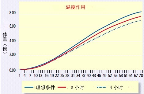 例如,一只38日齡的肉雞有912小時生長時間。如果生長速度偏離目標(biāo)體重1815g(4.0lb)115g,或者6.3%時。這就意味著需要增加6.3%的時間,或者57小時,肉雞才能達到目標(biāo)體重。更有可能,這種降低是來自一個時間段內(nèi)數(shù)個幾個小時導(dǎo)致的,在這樣的條件下生長速度不會理想。